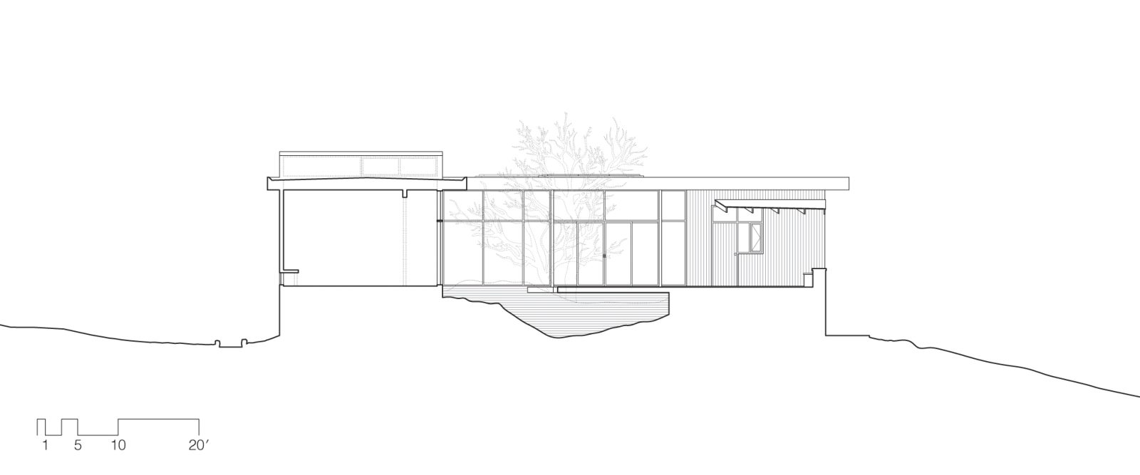 A curtain wall system of glass traces the perimeter of a mossy, rocky outcrop of oaks and grasses. The courtyard garden becomes the focus for kitchen, dining room, foyer, living room and master bedroom. It is a highly charged space which registers climate change; shady in the summer and open in the winter. Its mosses and leaves reflect seasonal shifts of time and light. The house interior is organized into three main zones connected by the large roof and broad circulation spaces. These “useful” areas are characterized by simple drywalled ceilings. The connection spaces are rendered in lightly stained pine slats which draw the eyes to outside soffits. Three exposed glulam beams describe the boundaries between the two kinds of spaces.