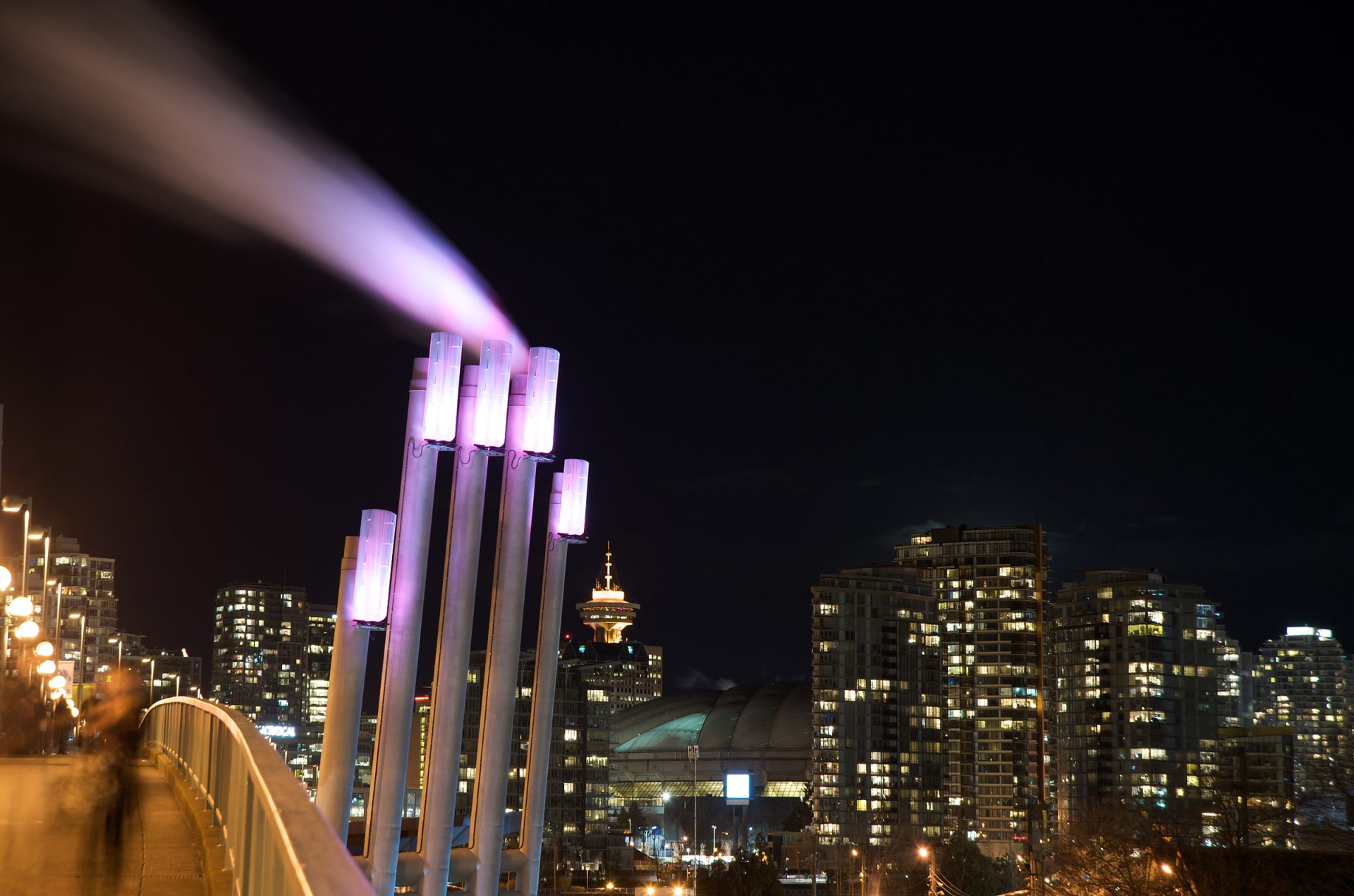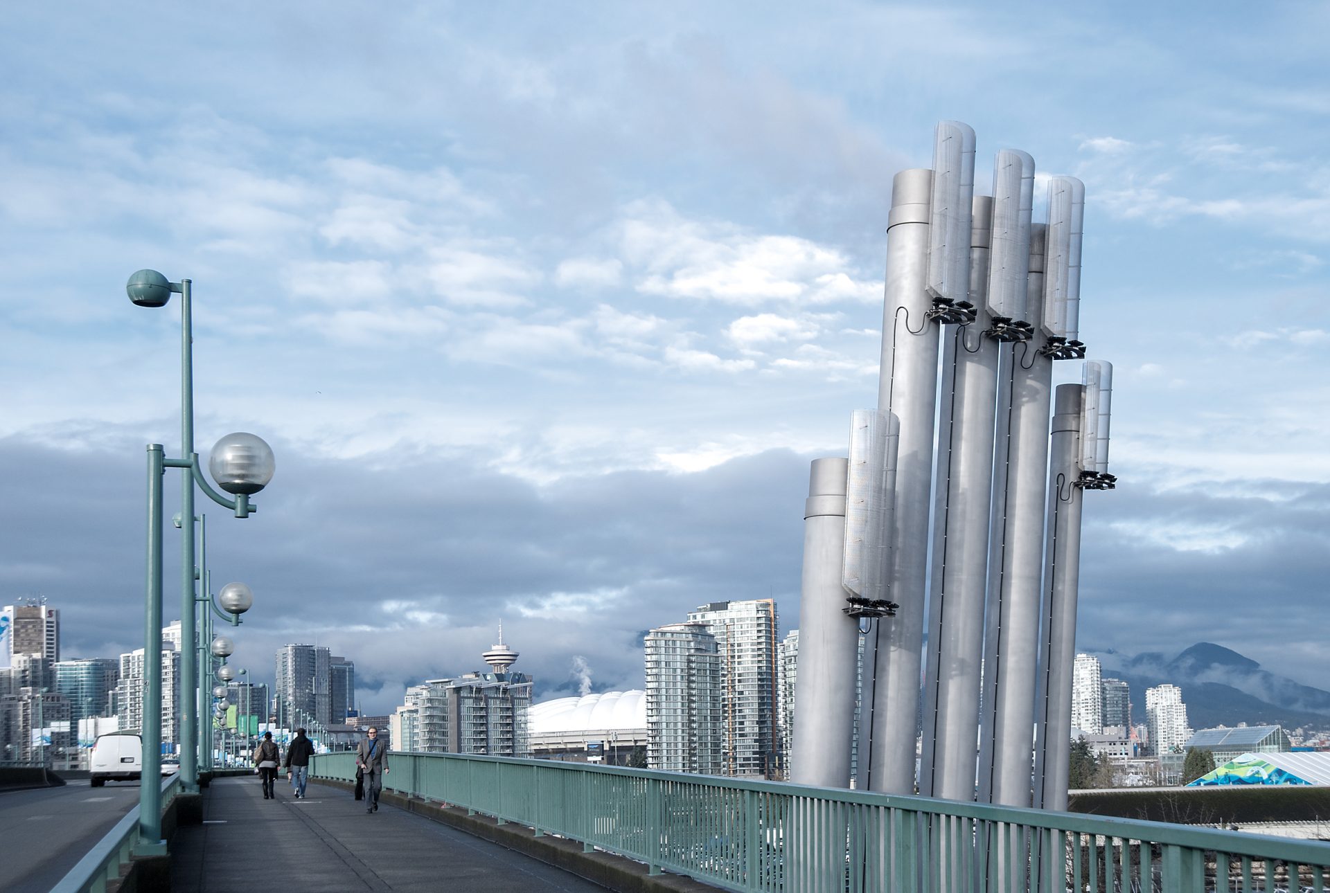 It’s a high five! This public artwork is located in the southeast False Creek community and Olympic Village in Vancouver. The mandate of the work is to interpret the functioning of the False Creek Energy Centre and form a gateway element to the downtown of the city.
