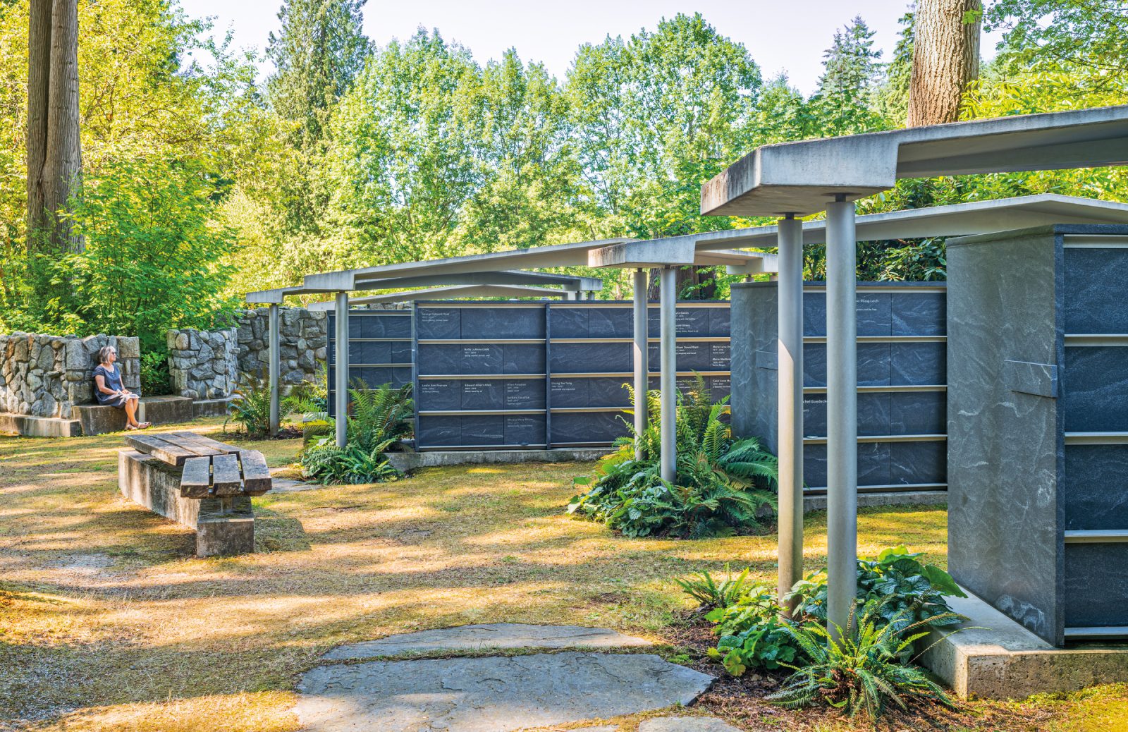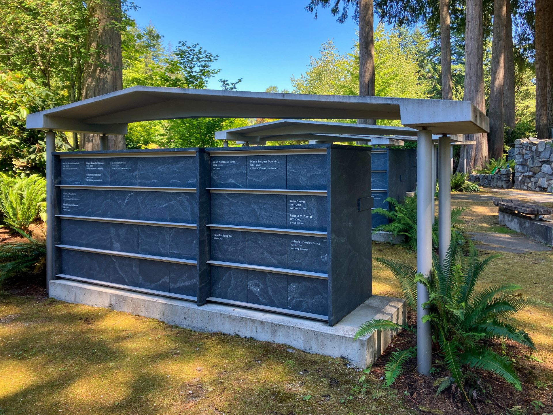This project is the second phase of a columbarium originally designed for Capilano View Cemetery in 1991. The new enclave accommodates up to 768 urns within granite-clad niches. Floating roofs imply a release of gravity. The space they form between the columbarium and sky is designed to create a view along the length of the site and beyond.